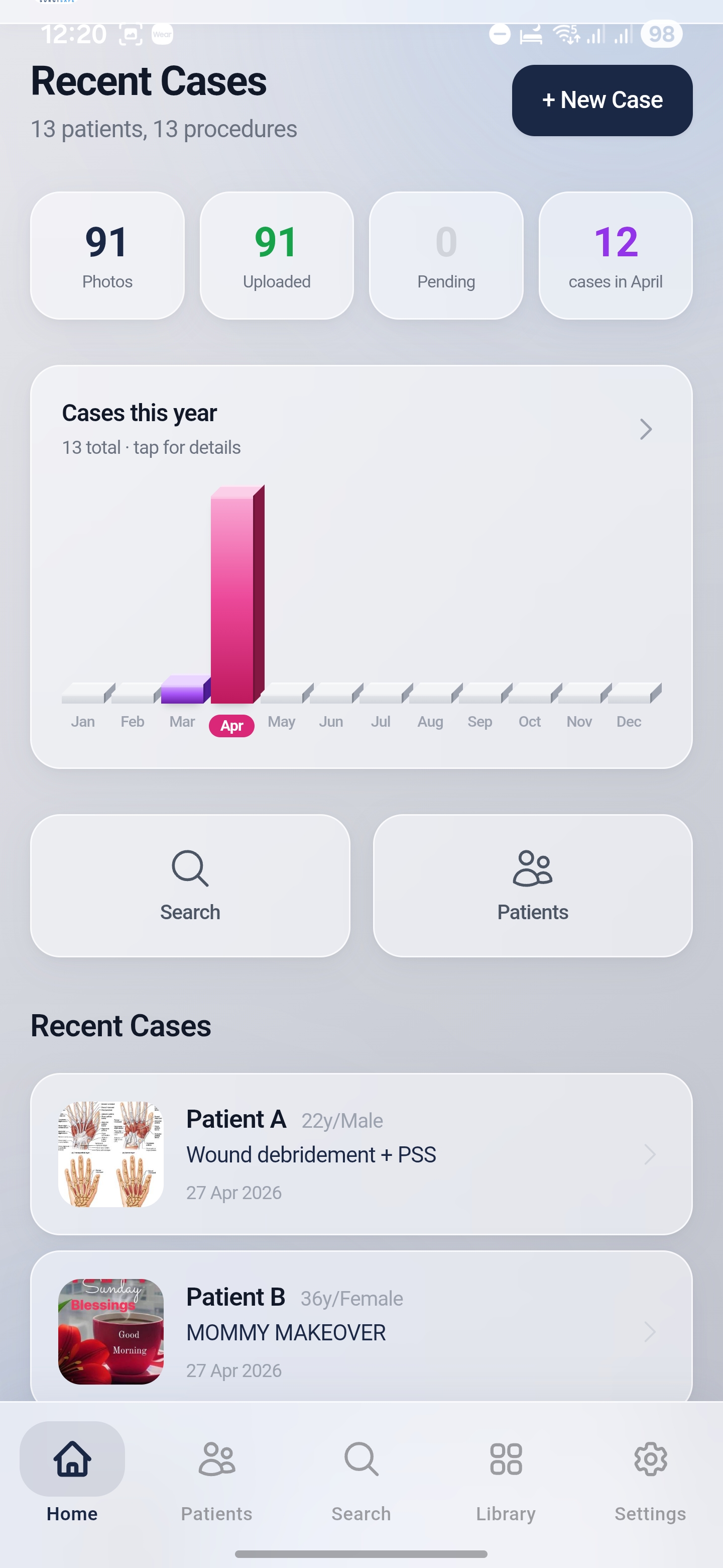 Photos uploaded, cases this month, recent work — everything you need to see when you open the app.
